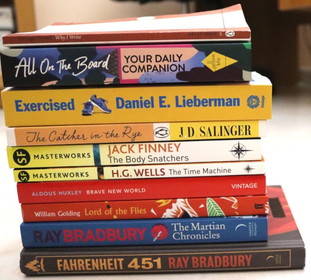 “Fahrenheit 451” è l’edizione speciale del 50° anniversario in copertina rigida, appena 14,99 sterline. “ Exercised” l’ho comprato perché mi pareva interessante. L’ho visto leggere in piscina all’aperto a Brixton a un ragazzo inglese.