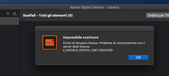 Scarico i due file ACMS, apro Adobe Digital Edition sul Mac e mi compare il messaggio che indica un superamento delle licenze che Google mi ha assegnato.