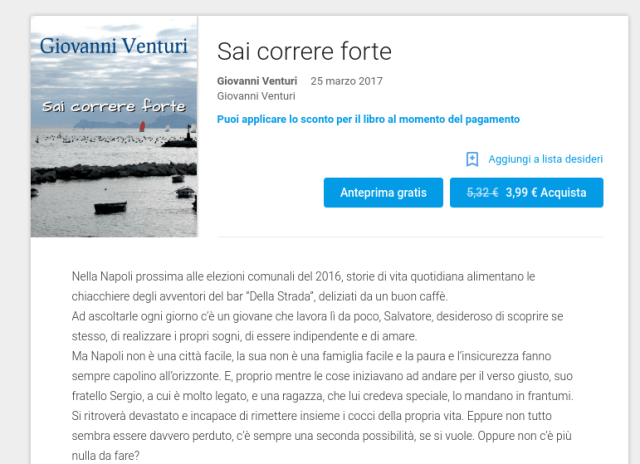 Quindi, ora che “Sai correre forte” non è più vincolato a essere presente solo sullo store di Amazon ed è finalmente presente in diversi nuovi store, Google Play Libri incluso, potreste comprarlo sul vostro dispositivo Android per 0,99 euro invece di 3,99, il che non guasta. Nota, infatti, la scritta “Puoi applicare lo sconto per il libro al momento del pagamento“. Questo vuol dire che i 3,99 euro che vedi non coincidono col prezzo di acquisto.
